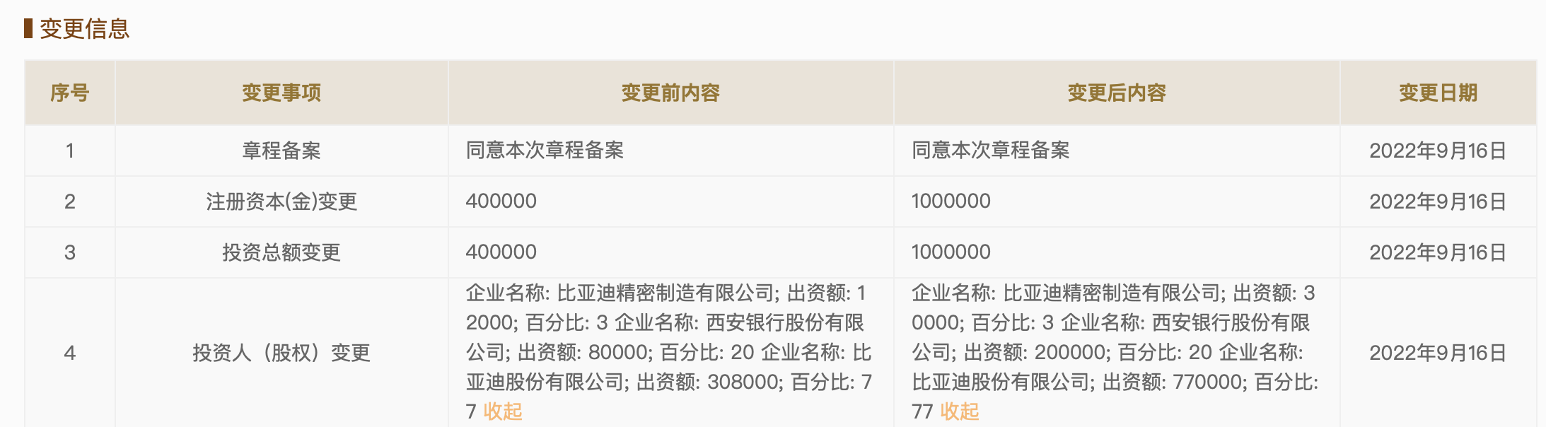 2022年4月,比亚迪公布的股东大会提案包括关于对参股公司比亚迪金融增资暨关联交易的议案。此次注册资本变更后,比亚迪金融股东比亚迪精密制造有限公司(下称 “比亚迪精密”)、西安银行和比亚迪(002594)的出资比例不变,仍是3%、20%和77%。