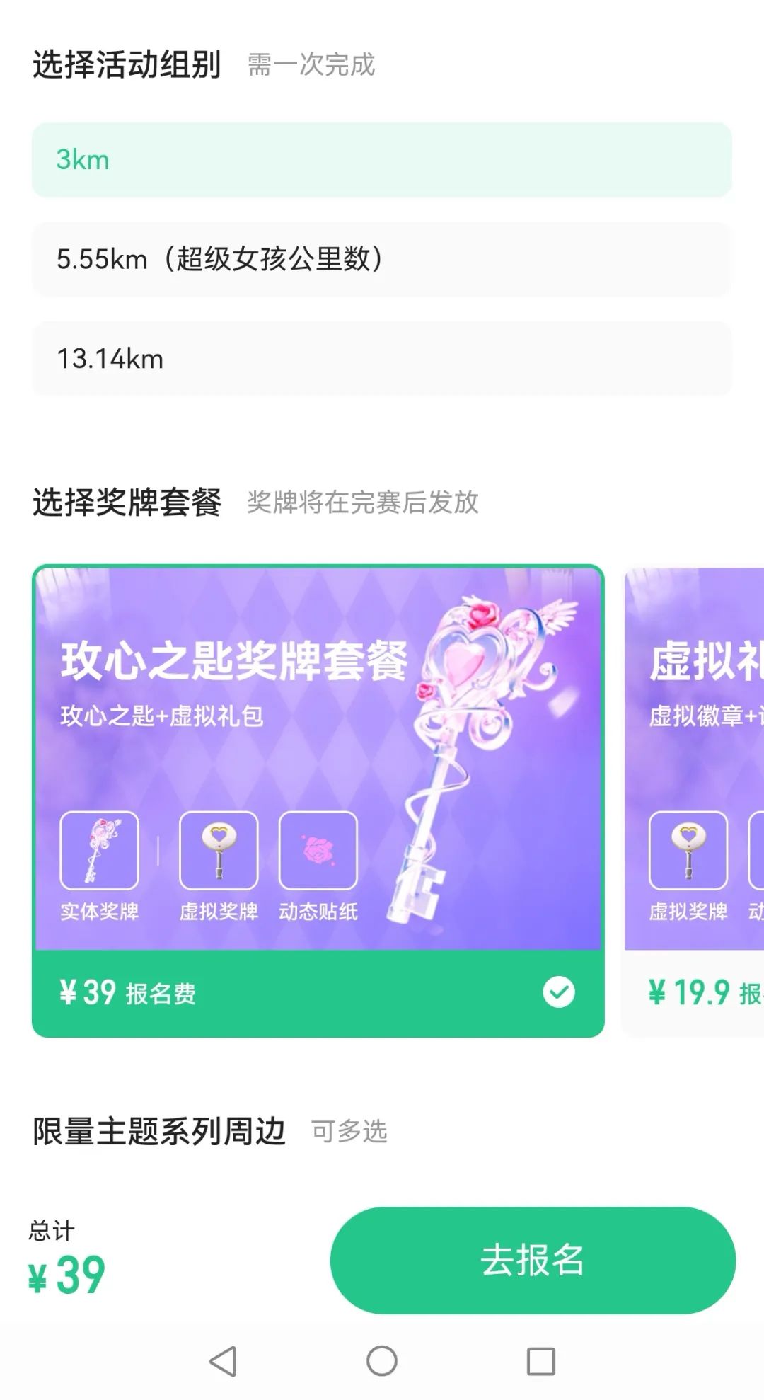 而这次线上跑步的奖牌,有29元的线上赛事礼包、39元的小天使奖牌、49元的小天使巧克力奖牌,以及89元的首饰套餐。