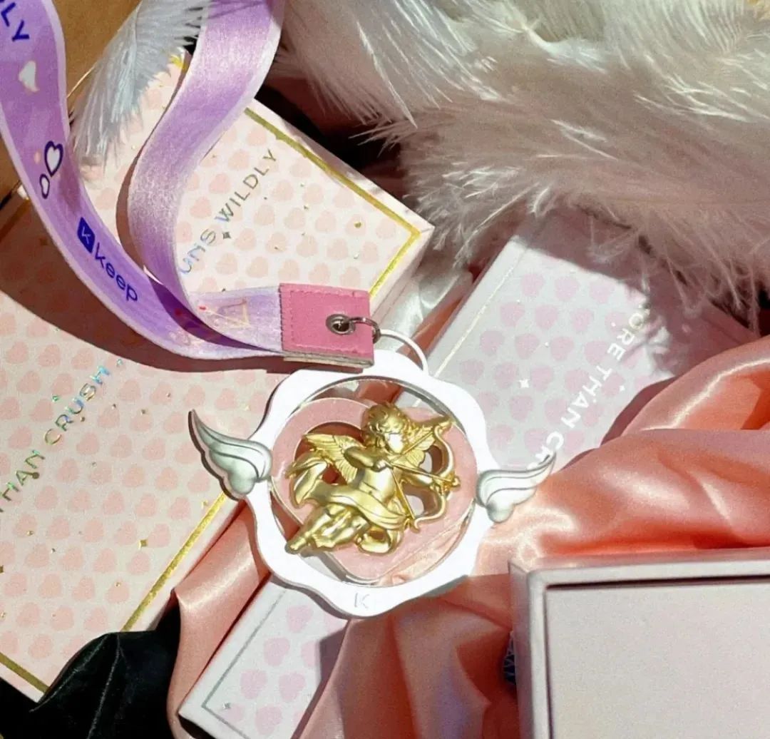 用户只要完赛,就能收到对应公里数的丘比特射箭奖牌。这个奖牌以银白色为基底,粉色爱心作点缀,金色丘比特置身其中,正引弓欲发。