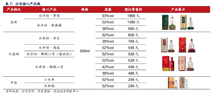 除了品牌宣传之外,水井坊在产品上也有针对性的向高端价格带发力,加大井台、典藏产品的支持力度。