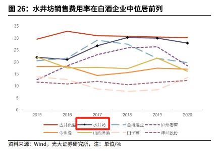 渠道的明显变化之外,水井坊在营销方面仍保持了较高水平的投入。今年上半年,水井坊的销售费用为6.96亿元,同比增加19.29%,销售费用率达33.56%,位居上市酒企前列。