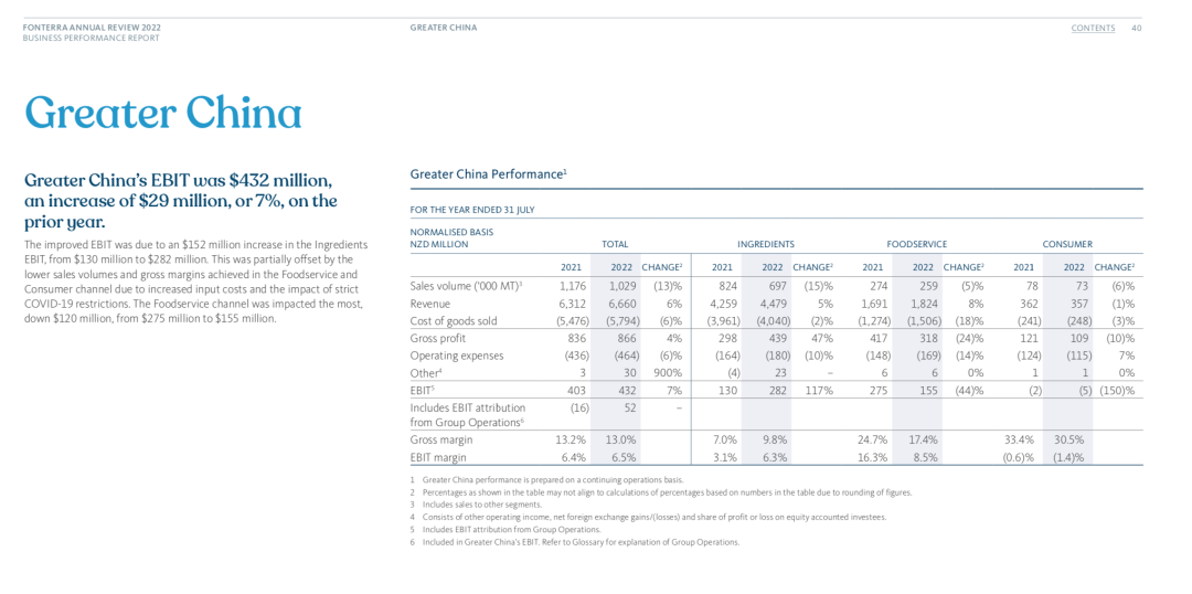 恒天然在年报资料中指出,由于投入成本增加和疫情影响,大中华区的餐饮服务业务和消费品牌业务的销量和毛利率有所下降,部分抵消了原料业务带来的盈利增长影响。