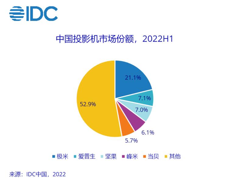 IDC数据显示,2022年上半年国内投影市场销量TOP5榜单为:极米、爱普生、坚果、峰米和当贝。在这份榜单中,只有爱普生成为外资品牌的“独苗”。而其他四家品牌都是国内投影市场的本土企业,且都是智能投影头部品牌。这说明在当下投影市场版图中,民族投影品牌已经成为绝对的“领航者”。