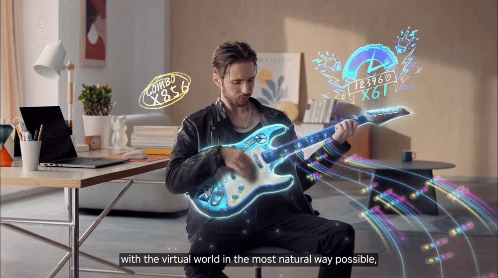比如说,PICO 4支持裸手交互,你可以抛开手柄,带着自己的双手直接进入虚拟世界,在虚拟世界里弹你的“空气吉他”。
