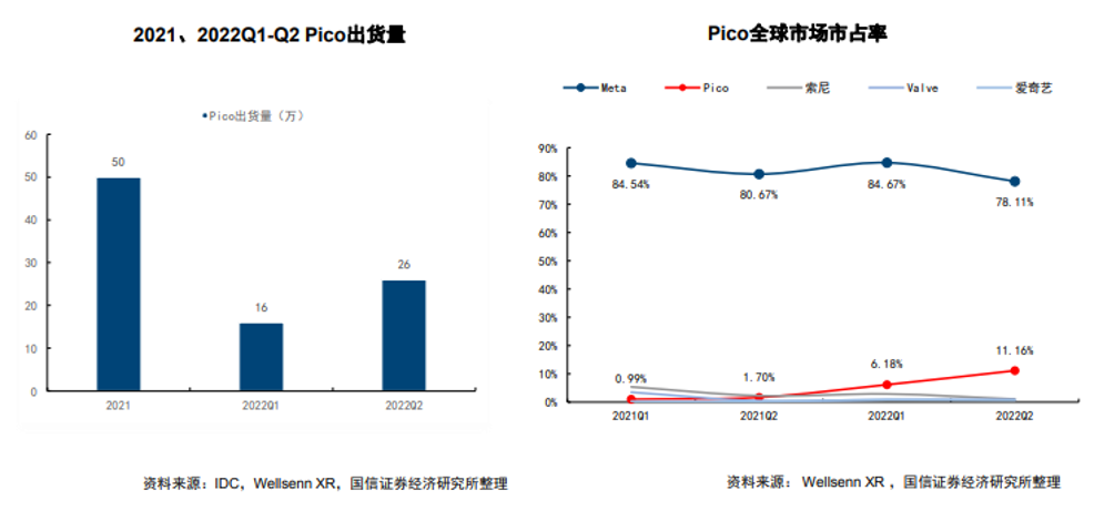国内顶流的VR品牌当属Pico。去年8月,字节跳动以90亿高价收购Pico,而后Pico发展迅速,保持中国VR市场份额第一。Pico还是除Oculus之外,全球市占率唯一提升的VR品牌,本土品牌市占率从2021年第四季度的38%提升至2022年第二季度的70%;全球市占率从2021年第一季度的0.99%提升至2022年第二季度的11.16%。