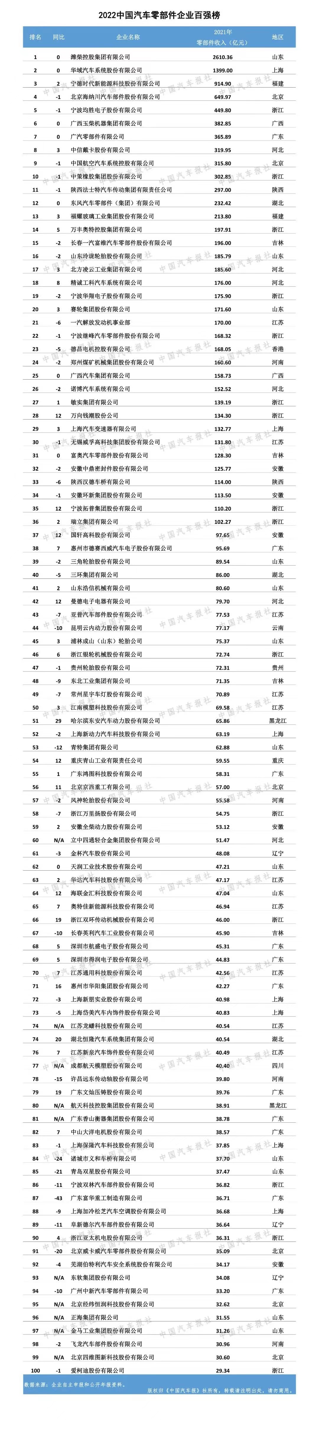 “2022中国汽车零部件企业百强榜”9月22日发布,根据2021年汽车零部件企业营收数据,潍柴控股集团有限公司以2610.36亿元的营业收入高居榜单第一位,华域汽车系统股份有限公司以1399.00亿元位居第二位,宁德时代新能源科技股份有限公司以914.90亿元位居第三名。