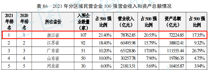 “2022中国民营企业500强榜单”显示,浙江共入围107家企业,占比21.40%,较上年增加11家,是唯一一个民营500强企业数量破百的省份,入围企业数量连续24年排名全国第一。