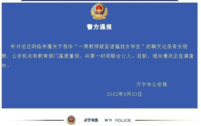 万宁市公安局9月23日在其微信公众号上通报,针对近日网络传播关于万宁市“一男教师疑言语骚扰女学生”的聊天记录有关视频,公安机关和教育部门高度重视,并第一时间联合介入。目前,相关情况正在调查中。