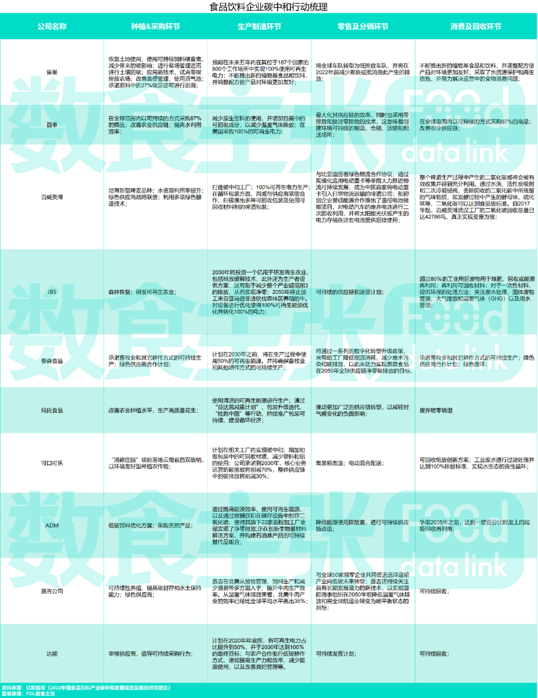 在亿欧智库发布的《2022中国食品饮料产业碳中和发展规划及路径研究报告》中清晰展示了全球排名前10的食品饮料公司为实现“碳中和”目标,在每一个环节做出的行动与努力。