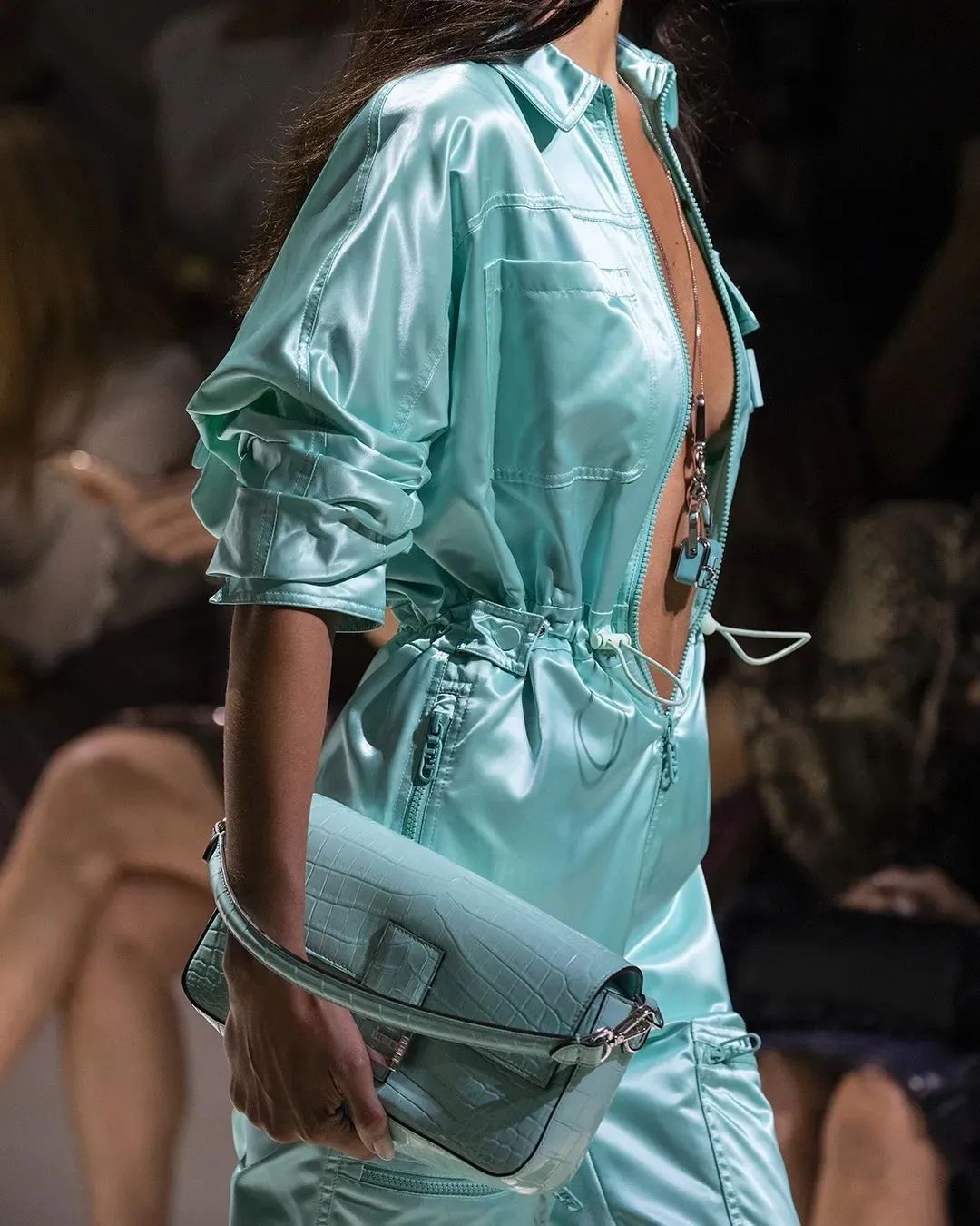9月10日,Fendi在纽约时装周上为其经典 Baguette手袋(法棍包)隆重举办了25周年纪念系列秀场。Baguette以各种形态、尺寸出现在不同单品上,遍布手套、帽子、裙子或是新款手袋本身之上。最吸睛的莫过于与Tiffany合作的两款Baguette手袋,分别由蓝鳄鱼皮和点状纯银制成,由新老两代顶级超模Bella Hadid和Linda Evangelista佩戴登台。