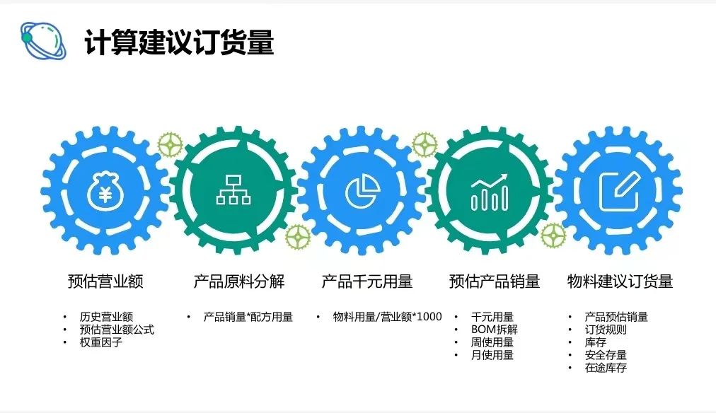 合阔智云副总裁陈坚告诉我,MRP智能订货系统会通过“预估营业额、预估产品销量、动态配方物料分解、原料订货量预测”等步骤,加上物料效期、订货配送周期、促销和节假日等权重因子等大数据,针对每家门店做出原料订货量预测。