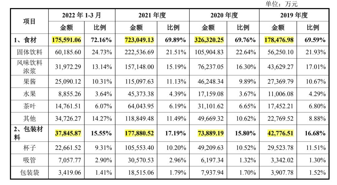 蜜雪冰城的主要营收也来源于向加盟商销售包括食材、设备等在内的系列产品。2019年至2021年,仅食材这一项,蜜雪冰城向加盟商收取的费用分别为17亿、32亿和72亿,占营收比基本为近70%。