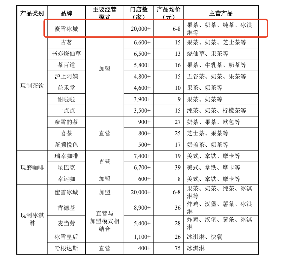 随后,蜜雪冰城做出了冰淇淋、冰咖啡等系列爆品,通过一步步加盟,成为拥有两万家门店的“雪王”。