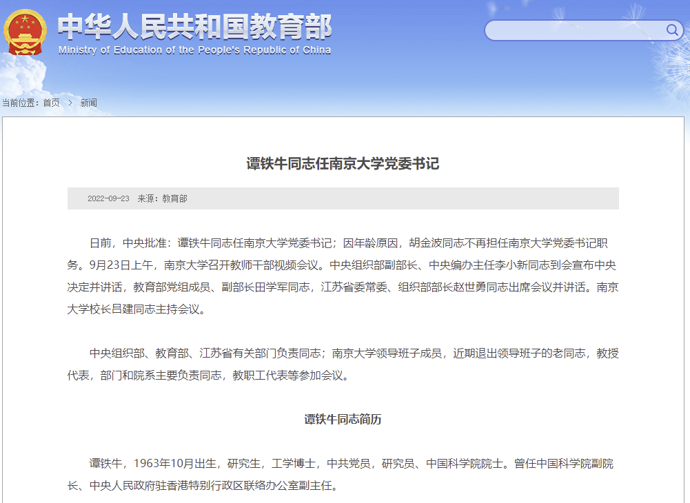 教育部网站9月23日消息,日前,中央批准:谭铁牛同志任南京大学党委书记;因年龄原因,胡金波同志不再担任南京大学党委书记职务。9月23日上午,南京大学召开教师干部视频会议。中央组织部副部长、中央编办主任李小新同志到会宣布中央决定并讲话,教育部党组成员、副部长田学军同志,江苏省委常委、组织部部长赵世勇同志出席会议并讲话。南京大学校长吕建同志主持会议。