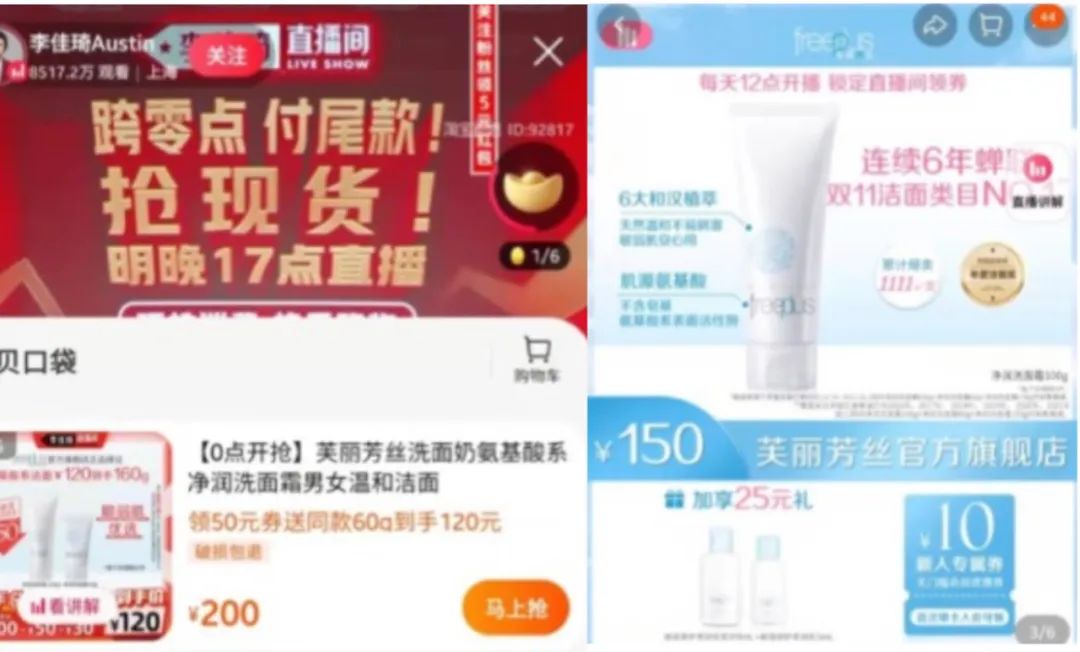 图|芙丽芳丝在李佳琦直播间(左)和天猫旗舰店(右)的价格对比