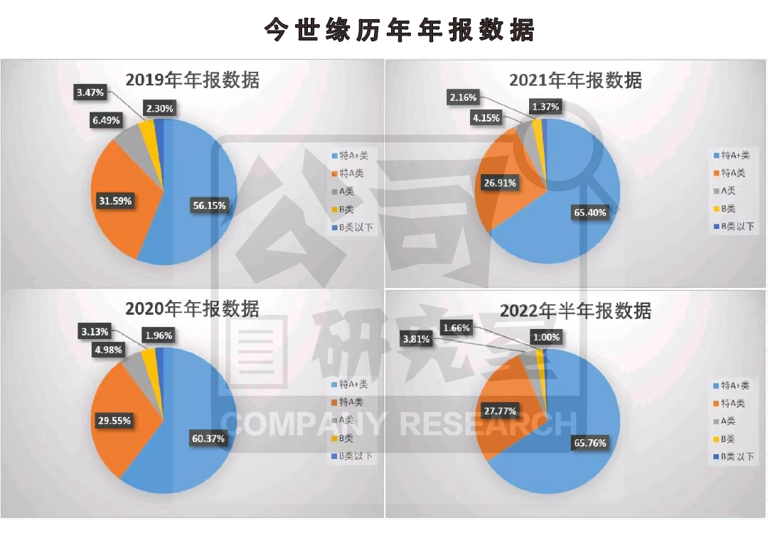 2019年6月底,特A+类产品占比为54.78%,2019年底为55.77%;2020年底为59.95%;2021年年底为65.03%.2022年6月底为65.44%。显然,从年度看,2019 -2020-2021,这一占比确实有较大提高,每年提升5%左右。