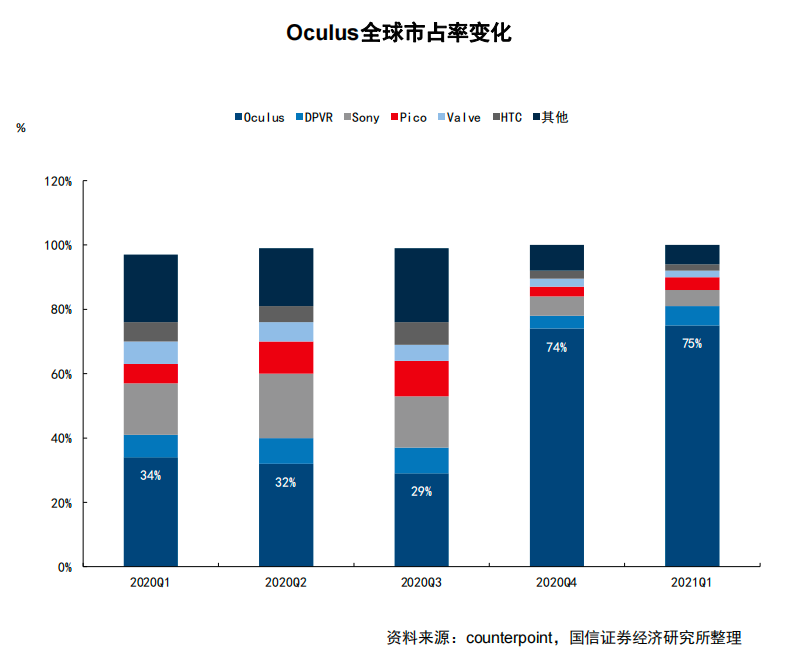 从2014年7月的Oculus Rift到2020年10月的Oculus Quest2,Oculus的市占率从2020年的不足30%提升到了今年一季度的90%。