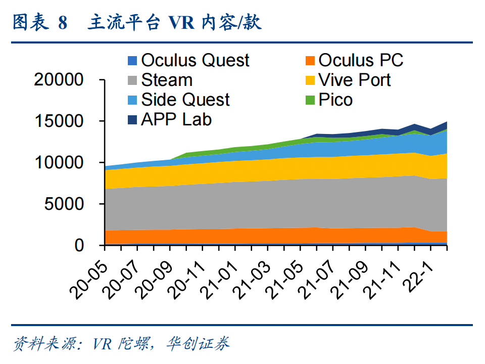 目前,市场上最大的VR内容分发平台是Steam,内容应用数为6574个,Quset包括三个内容平台合计为4952个应用。