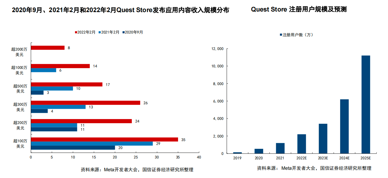 对应到用户规模,2021年Quest平台的注册用户是1200万,2022年有望达到2200万,VR陀螺的预测中,2025年有望超过1亿。