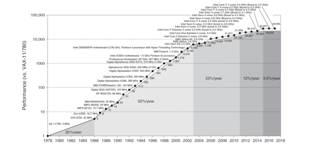 从80年代中期到本世纪初,根据Patterson和Hennessy的统计,CPU单核性能的年均增长率达到了52%。但从本世纪初开始,由于功耗限制和内存延迟等原因,CPU的单核性能增速开始大滑坡,年均性能提升逐渐降至3.5%。