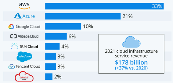 根据Statista的统计,2021年全球云计算市场规模达到1800亿美元。以Q4季度为例,整个市场仍以AMG三家主导。其中AWS以1/3的份额领先,与Azure占据Top2,Google Cloud则以10%的市场份额处于第三位。国内厂商营收最高的为阿里云,凭借在中国大陆和亚太地区的市场领先,收获约6%的全球营收份额。