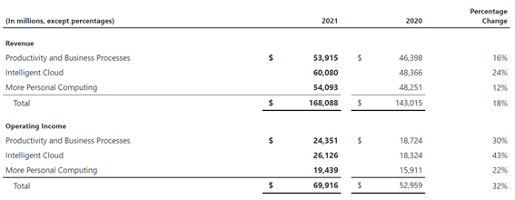 而微软这边,智能云业务同样表现亮眼。该部分营收从2020年的484亿美元,增长至601亿美元,同比变动约为24%。但与国内云计算厂商“增收不增利”形成鲜明对比的,是其同期的经营利润大幅攀升43%,从2020年的183亿美元增长至2021年的261亿美元。相应的,这部分业务的利润率也从38%增至43%。