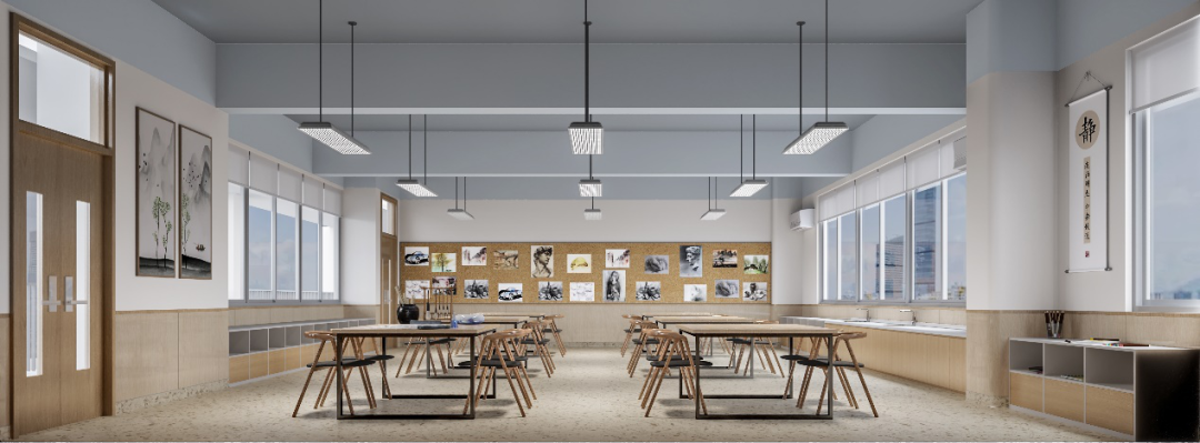 可以作为书画室一体使用的教室,不仅拥有清洗池和储藏柜,还可用墙面嵌入式的软木板展示教学的成果和学生的作品,视线所及之处,皆可呈现美感。