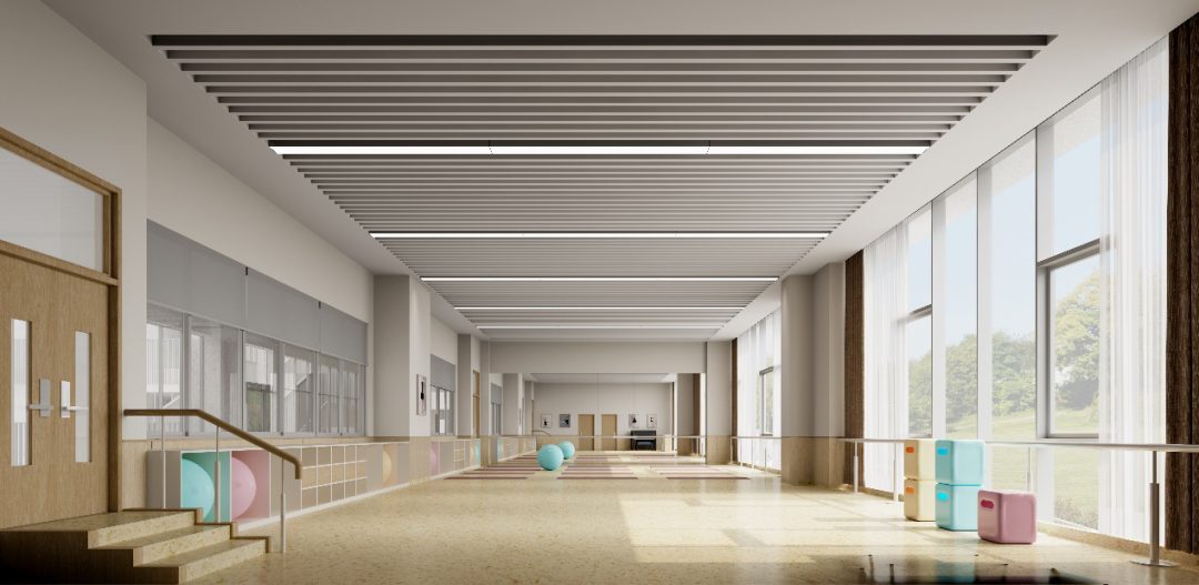 舞蹈教室配置专业,材料考究,墙面和天花隔音满足了日常教学需求,同时增加整面的墙面镜方便老师进行舞蹈教学的指导。