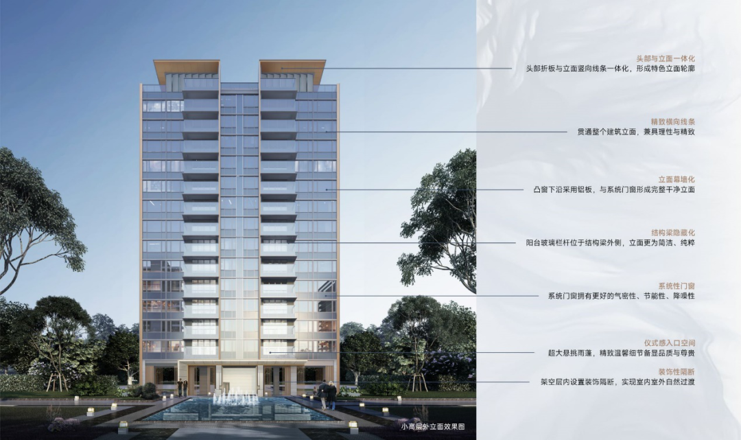 与市场上大多数层高30余层的建筑项目不同,深铁珑境花园总高十余层,并不会产生明显的压迫感。平整的玻璃幕墙下,项目外立面看上去充满一种现代化的美感,既整洁又明亮。