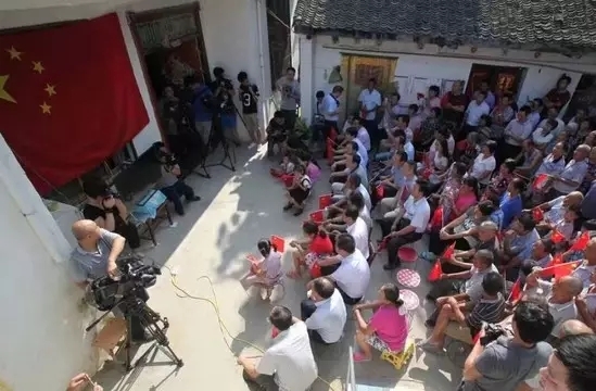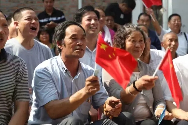今天一大早,大家就拿着椅子来到朱婷家的大院子里,家人搬了电视机出来一起观看。还有人专门准备了一面大国旗,为中国女排和朱婷助威。