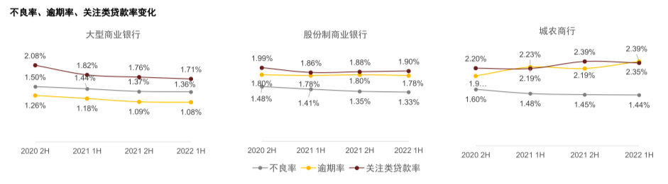2022年6月末,59家上市银行的贷款质量指标整体保持稳健,不良率从2021年末微降0.01百分点至1.36%,关注类贷款率降0.03百分点至1.84%,逾期率微升0.01百分点至1.42%。