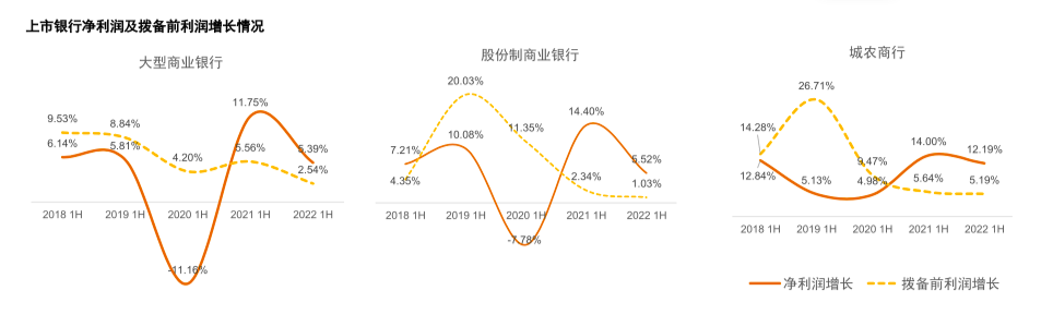 据《报告》统计,上半年,59家上市银行的整体净利润同比增长6.28%至1.09万亿元,拨备前利润同比增长2.06%,较2021年同期均略有放缓。其中,大型银行营收稳定,股份制商业银行与城农商行的利息收入增速放缓,投资收益支持利润增长。