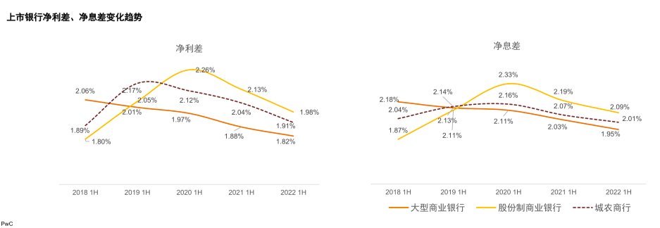 普华永道中国内地金融业合伙人胡亮表示,上半年,上市银行的盈利指标总体呈现缓慢下行的态势。银行业总体息差的压缩使得各上市银行依靠资产规模带来的创收效率不及以往。大型商业银行与股份制商业银行在盈利能力指标上走势总体趋同,城农商行依靠比股份制商业银行更低的息差降幅及投资收益的增长,在平均总资产收益率上表现的更为稳定。