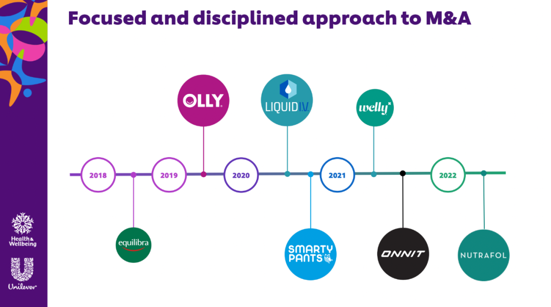 对此,乔安路回应称,这一比例数字是对的,自2017年以来,联合利华约有160亿欧元用于收购,90%集中在两个领域,即对高端美容品类的补强收购和对功能性营养保健品的补强收购。