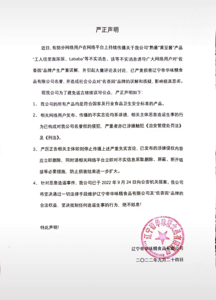 佐香园调味品旗舰店消息,9月24日,辽宁帝华味精食品有限公司发布声明:近日,有部分网络用户在网络平台上持续传播关于我公司“熟酱”“黄豆酱”产品“工人往里面尿尿、Lababa”等不实消息。该等不实消息已严重损害公司名誉,并造成社会公众对“佐香园”品牌的误解和质疑,影响极其恶劣。针对恶意造谣事件,我公司已于2022年9月24日向公安机关报案。