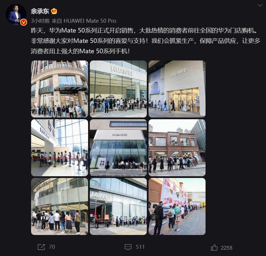 华为终端业务CEO余承东更是亲自下场为Mate50带货。