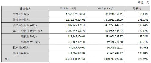 收入种类方面,数据显示,上半年度收入大幅上升的背后主要依赖于终端销售以及会员付费收入的上升。其中终端方面上半年度乐视网实现了51.32亿元的销售收入,同比增长171%;会员费销售实现了27.09亿元的收入,同比增长152%。截至2016年6月30日,乐视超级电视上市三年累计销售量约700万台。此外,虽然不在上市公司内的超级手机,也在5月实现总销量突破1000万台。