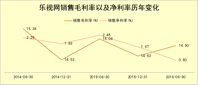 毛利率方面,乐视的数据基本与前期持平。数据显示,2016年上半年度乐视的毛利率为14.9%,去年同期以及2015年全年毛利率分别为15.08%以及14.63%。但是变化较为明显的是净利率指标。相比去年同期2.45%的净利率,今年上半年度的净利率仅为0.8%,同比下降了1.65个百分点,下降比例超过67%。