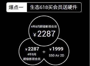 但是一码归一码,营销的所谓“买会员送硬件”的活动,在会计上断然是不会如此处理的。按照国内现行的会计准则,购买的金额中是包含了硬件以及会员收入,应当按照比例在硬件和会员费上做出分摊。举例来说,乐视618的生态活动日上,其中一则活动是用2287元购买4年零8个月的超级影视会员,可以得到价值2287元的4年零8个月的超级影视会员,以及一台价值1999元的S50 Air 2D超级电视。但是这一营销活动,在会计上的处理,是按照比例,将2287元的收入在终端硬件和会员收入上分摊。按照惯例,会员和终端的收入比例可能是二八分或者三七分,终端自然是占了绝大部分。