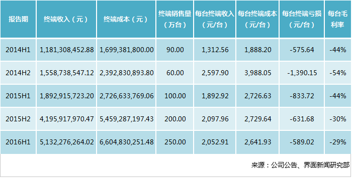 数据显示2014年、2015年以及2016年上半年五个半年度终端分别销售90万台、60万台、100万台、350万台以及250万台。加之每半年度的终端收入以及终端成本,测算出每台终端分别亏损575元、1390元、833元、631元以及589元,亏损额在收窄。此外,五个半年度每台终端的毛利率分别为-44%、-54%、-44%、-30%以及-29%,毛利率在持续增加。