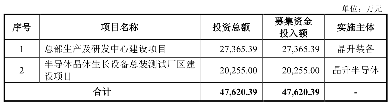 晶升装备的保荐机构是华泰联合,融资金额为4.76亿元。该公司是一家半导体专用设备供应商,主要从事晶体生长设备的研发、生产和销售,公司已推出了自主研发的12英寸半导体级单晶硅炉并实现了量产销售。晶升装备此次募资4.76亿元,将投入到“总部生产及研发中心建设项目”(2.74亿元),和“半导体晶体生长设备总装测试厂区建设项目”(2.03亿元)。