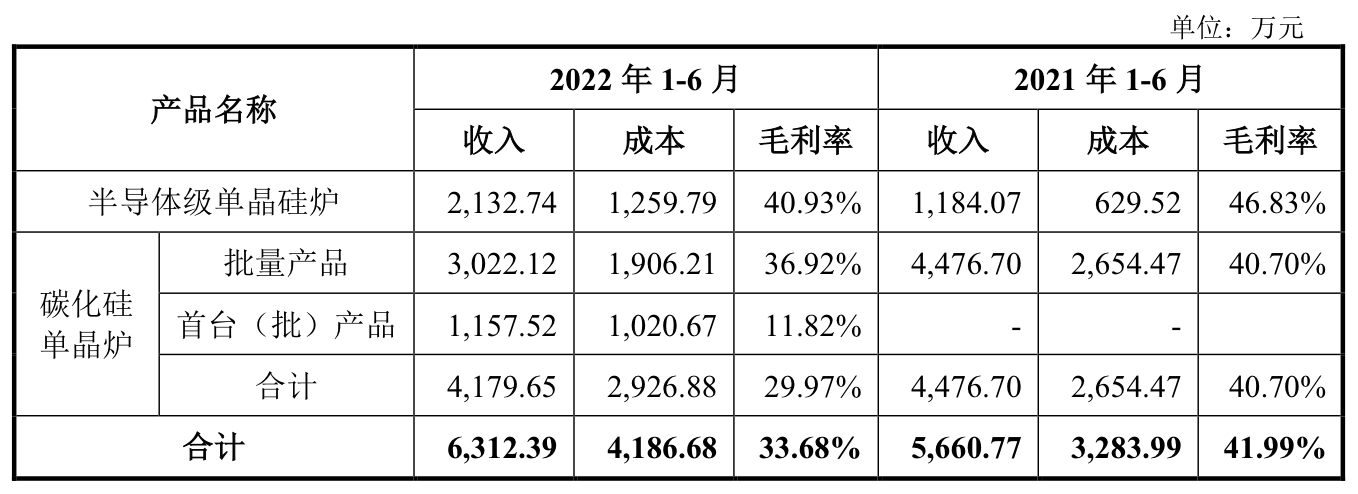 业绩方面,晶升装备2022年1-6月的营业收入6505.58万元,较上年同期的6017.52万元增幅为8.11%;但上半年归母净利润却只有275.74万元,较2021年1-6月的1540.37万元相比,下滑82.1%;甚至2022年1-6月的扣非净利润还是盈转亏,亏损额为286.5万元,同比变动-134.36%。2022年1-6月晶升装备的毛利率为33.68%,远远低于2021年1-6月的41.99%。晶升装备预计2022年1-9月的营业收入为1.3亿元-1.4亿元;净利润1400万元-1600万元。