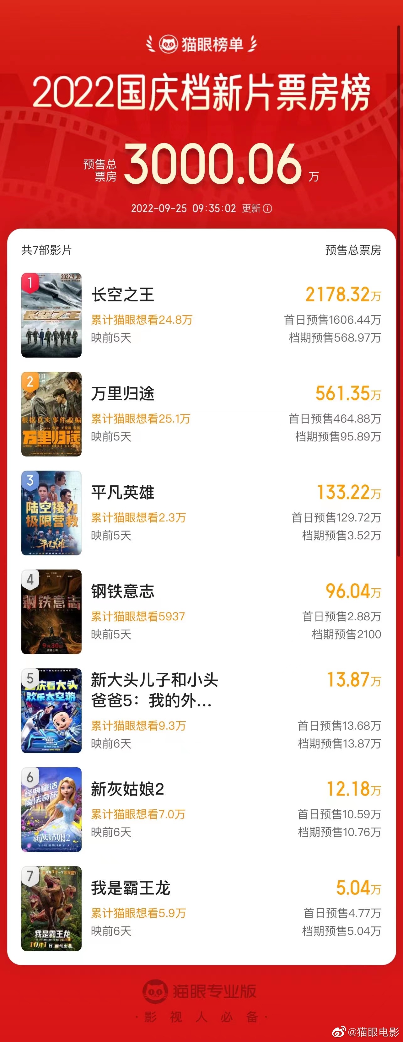据@猫眼电影 微博消息,9月25日9时34分,2022年国庆档新片预售总票房破3000万,《长空之王》《万里归途》《平凡英雄》分列预售榜前三位。