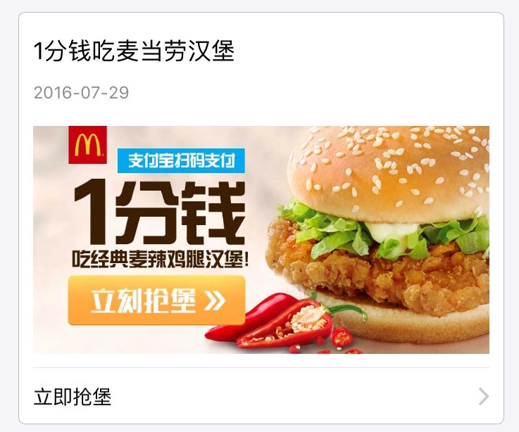 “1分钱抢麦当劳经典麦辣鸡腿堡”“5元抢原味板烧鸡腿堡”“1分钱阳光橙”……最近一个月,麦当劳在支付宝口碑平台上进行了一轮密集的促销。