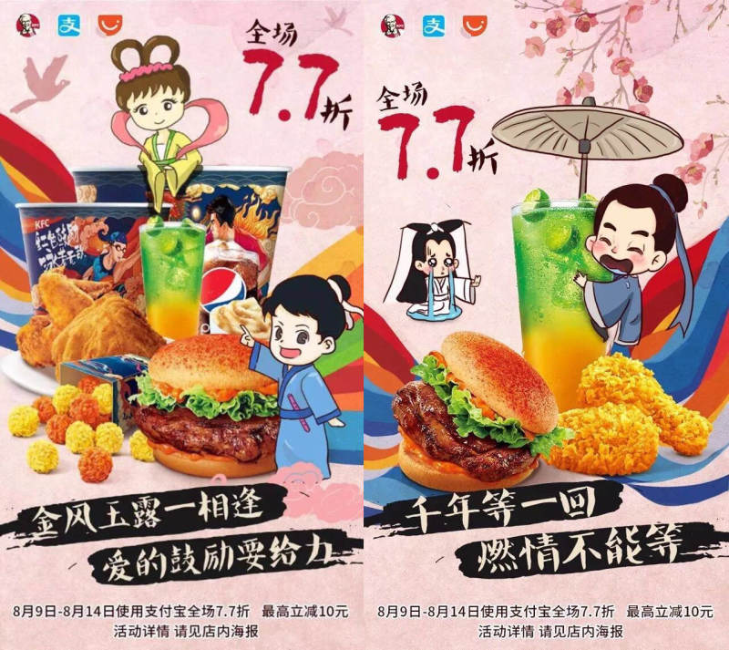在今年七夕节,另一家快餐巨头肯德基,也发出了使用支付宝买单,就能获得全场7.7折的活动。在宣传海报上,也拉来了牛郎织女以及许仙白娘子等古典CP的卡通形象来吸引关注。