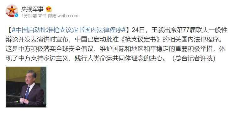 @央视军事 微博9月25日消息,24日,王毅出席第77届联大一般性辩论并发表演讲时宣布,中国已启动批准《枪支议定书》的相关国内法律程序。这是中方积极落实全球安全倡议、维护国际和地区和平稳定的重要积极举措,体现了中方支持多边主义、践行人类命运共同体理念的决心。