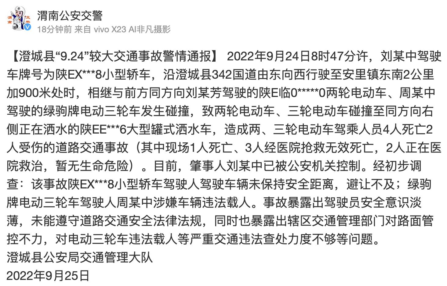 据@渭南公安交警 微博消息,9月25日,澄城县公安局交通管理大队发布澄城县“9.24”较大交通事故警情通报。2022年9月24日8时47分许,刘某中驾驶车牌号为陕EX***8小型轿车,沿澄城县342国道由东向西行驶至安里镇东南2公里加900米处时,相继与前方同方向刘某芳驾驶的陕E临0*****0两轮电动车、周某中驾驶的绿驹牌电动三轮车发生碰撞,致两轮电动车、三轮电动车碰撞至同方向右侧正在洒水的陕EE***6大型罐式洒水车,造成两、三轮电动车驾乘人员4人死亡2人受伤的道路交通事故(其中现场1人死亡、3人经医院抢救无效死亡,2人正在医院救治,暂无生命危险)。目前,肇事人刘某中已被公安机关控制。