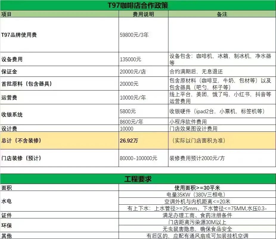 除此之外,T97还做着加盟的生意。据锌刻度了解,T97目前的咖啡店加盟合作政策费用主要有品牌使用费59800元/3年;设备费用135000元(包含咖啡机、冰箱、制冰机、净水器等);保证金20000元(合约满期后退还);首批原料器具费用20000元(咖啡豆、牛奶、包材、杯子等);运营费10000元/年(线上平台美团、饿了么、小红书、抖音等平台);收银系统5800元/年、小程序软件费用8600元/年;设计费10000元,总花费约为26.92万元。另外,加盟商还需准备2000元/㎡的装修费用。