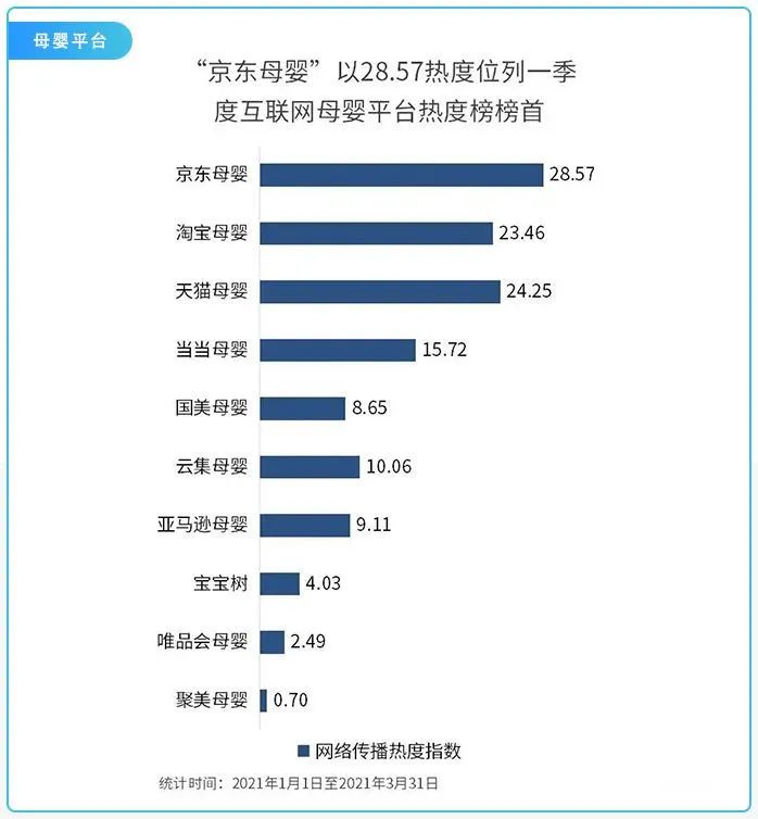 第一,综合母婴电商平台声量更高、优势更大。据2021年一季度,大数据研究院公布的互联网母婴行业网络关注度分析报告的数据来看,京东母婴以28.57的网络传播热度指数,成为最受关注的互联网母婴平台。而阿里母婴、当当母婴、国美母婴都紧随其后。