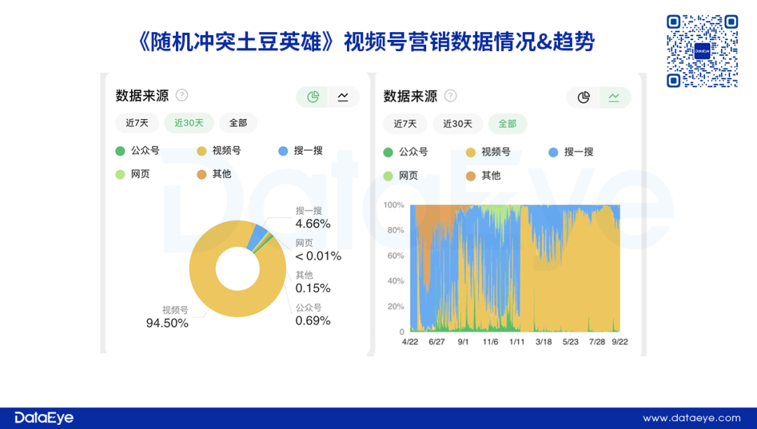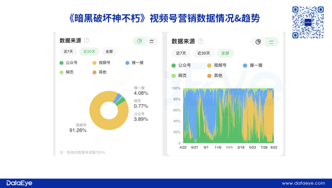 另外,国内不少头部厂商逐渐倾向于视频号。微信指数显示,网易《暗黑破坏神不朽》近30天微信指数来源中,视频号占比高达91.26%。从时间维度来看,今年3月份开始全面布局视频号内容。